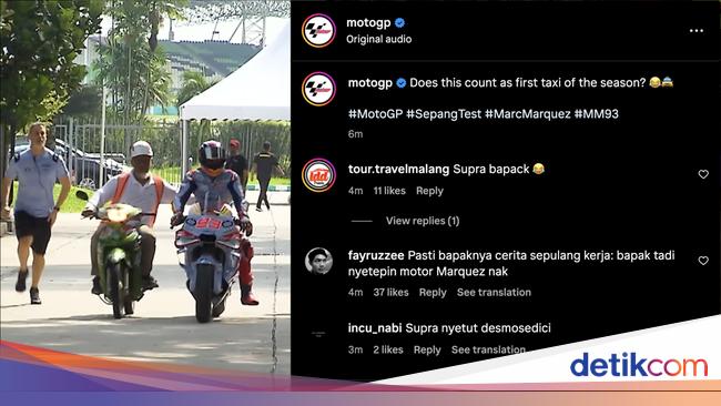 Marc Marquez yang telah bergabung dengan tim Gresini Racing menjajal motor Ducati Desmosedici GP23 di Sepang. Ada momen menarik saat Marquez menguji coba motornya di Sepang. Motor Marquez yang mogok distut oleh marshal yang menggunakan motor bebek.